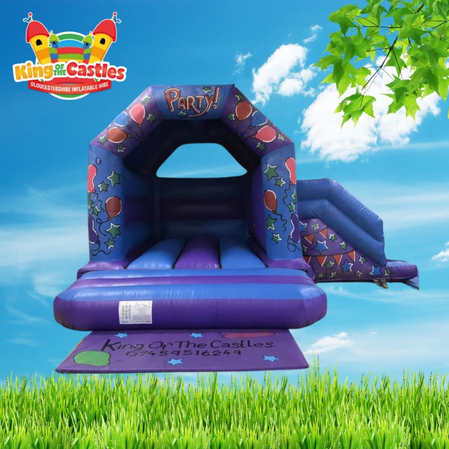 Whether you’re hosting a children’s birthday party, a community event, a family celebration, or any other event in Cheltenham, Gloucester and beyond, our Bounce and Slide Bouncy Castles are sure to be a crowd-pleaser. The vibrant blue and purple colour scheme, adorned with balloons and stars, makes them a versatile choice for both boys’ and girls’ parties. The built-in slide adds an extra layer of fun, keeping the kids entertained and active throughout the event.
