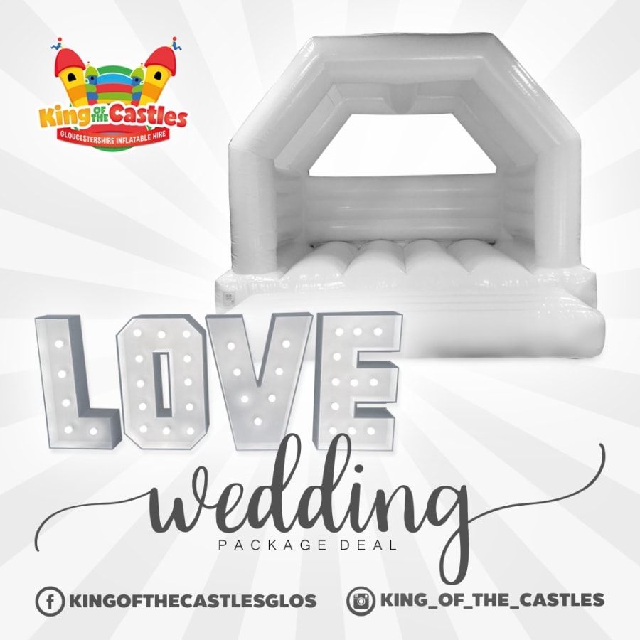 So set the scene for romance with King of the Castles Gloucester's Wedding Package, available across Cheltenham, Gloucester, Tewkesbury, Stroud, and the picturesque expanse of Gloucestershire. This enchanting party package is crafted to bring a fairy-tale touch to your nuptials, offering the magic of our LED Love Letters and the whimsy of a white wedding bouncy castle to delight your guests.